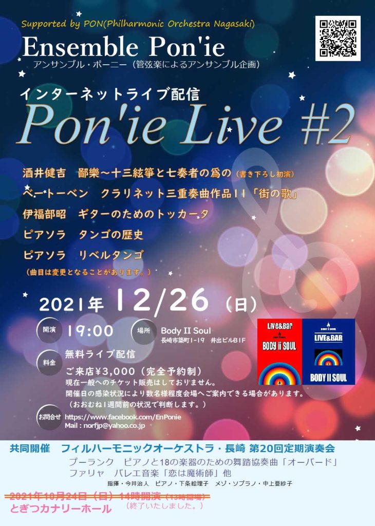 2021年12月26日(土)、19時より長崎市築町にあるオシャレなバー「Boday Soul」さんでのオンラインライブが決定しました。フィルハーモニックオーケストラ長崎のメンバーにより結成された管弦楽によるアンサンブル「Pon’ie’(ポニー)」の豪華なライブです。