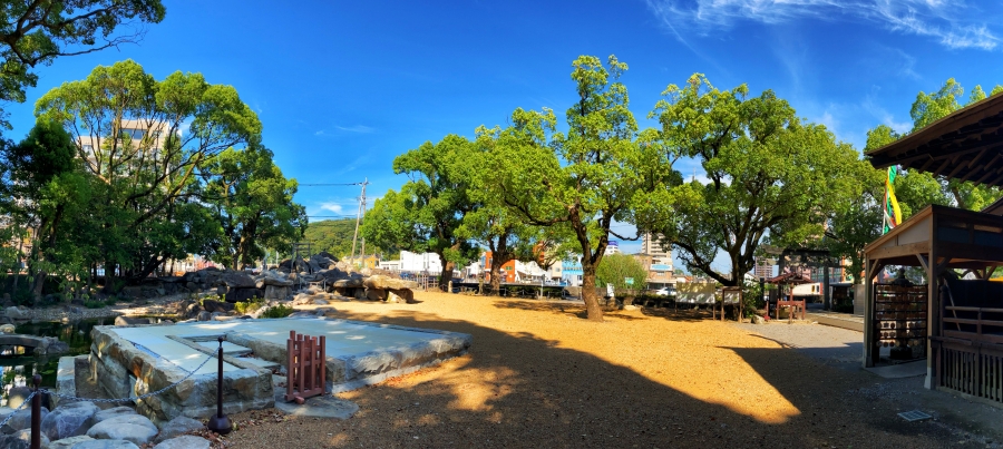 去年から庭園が整備されている途中だそうで、諫早神社のご神体ともいえる九州の守り神が宿る「雲仙」の山景を忠実に再現した「雲仙塚」が造られていたり、水が湧き出る御池があったり御神木のクス群に囲まれていて実にパワーみなぎる神社です。庭園には雲に見立てた「雲舞台」があり、そこで演奏いたします。